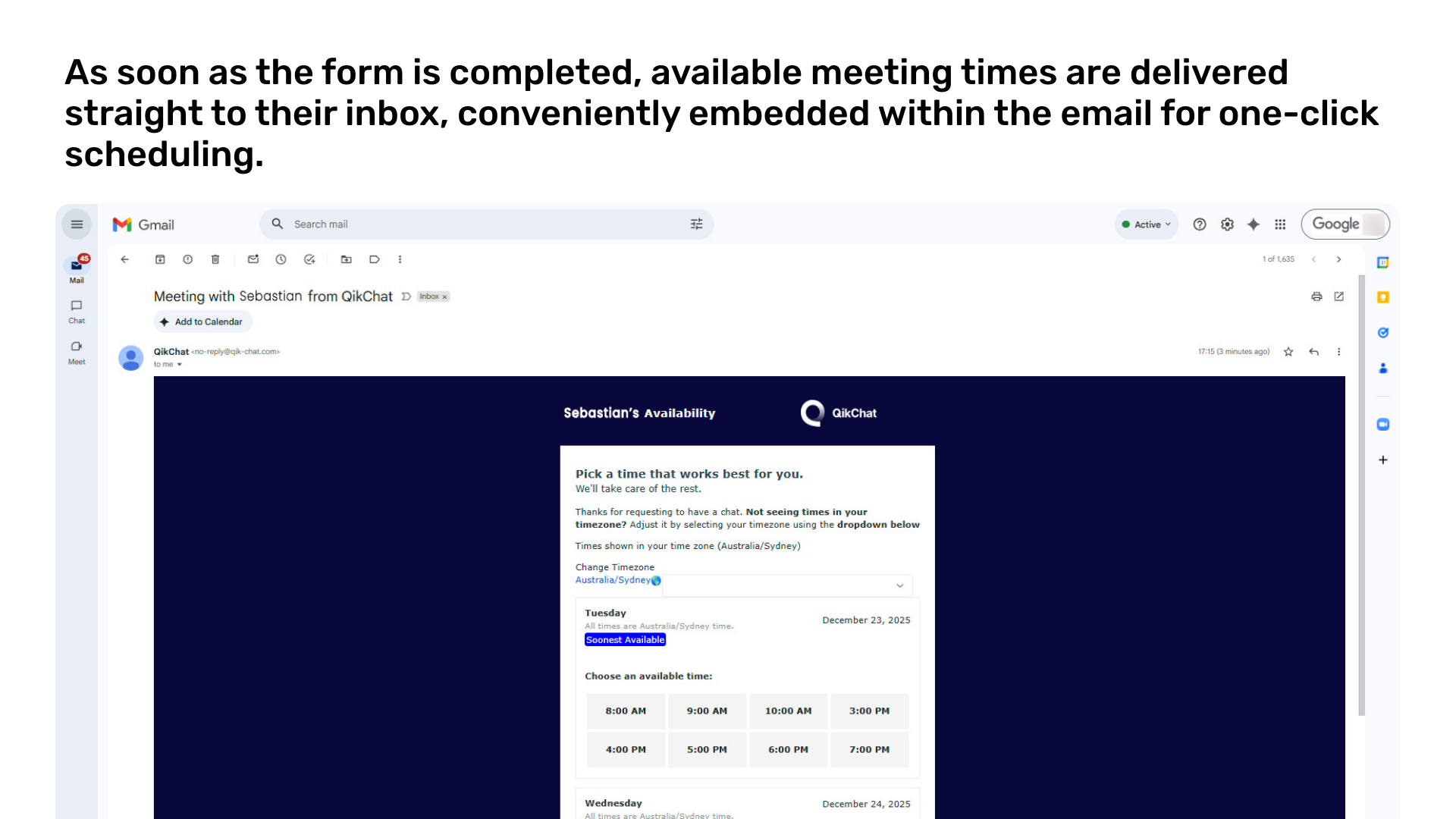 QikChat connects leads with the right team member immediately after form submission, bypassing the inbox and eliminating manual “select a time” back-and-forth. Our one-click scheduling syncs directly with team calendars and automatically calibrates for all time zones to ensure a seamless global experience. By turning form fills into confirmed meetings in seconds, you build immediate trust and significantly reduce no-shows.