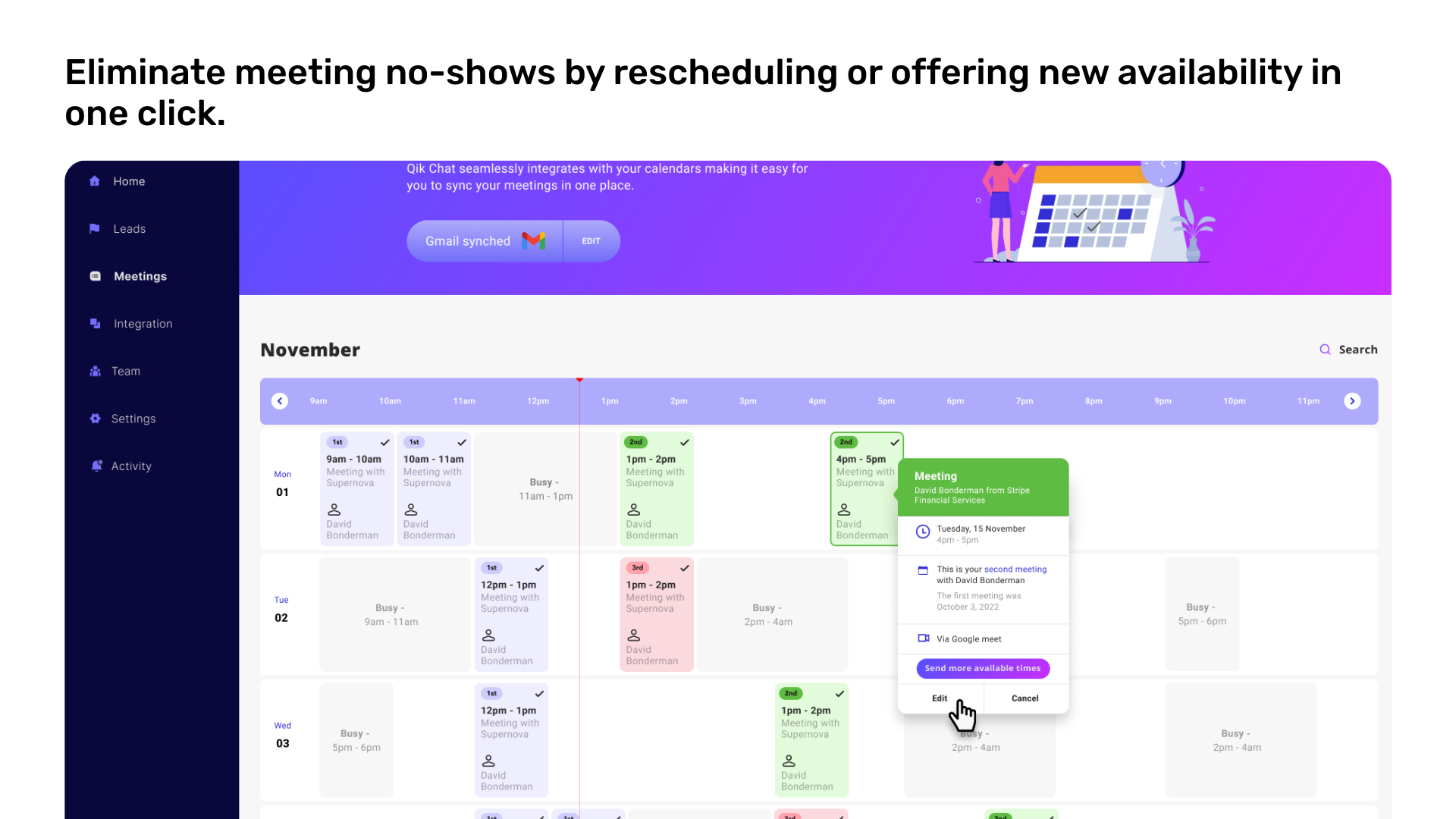 QikChat allows you to reschedule meetings at any stage with a single click, effectively mitigating the risk of no-shows and cancellations. Gain total visibility into lead engagement and sales cycle progress directly from your calendar, allowing you to identify gaps and offer earlier availability. By instantly providing new meeting options, you maintain momentum and ensure your most valuable leads stay on track.